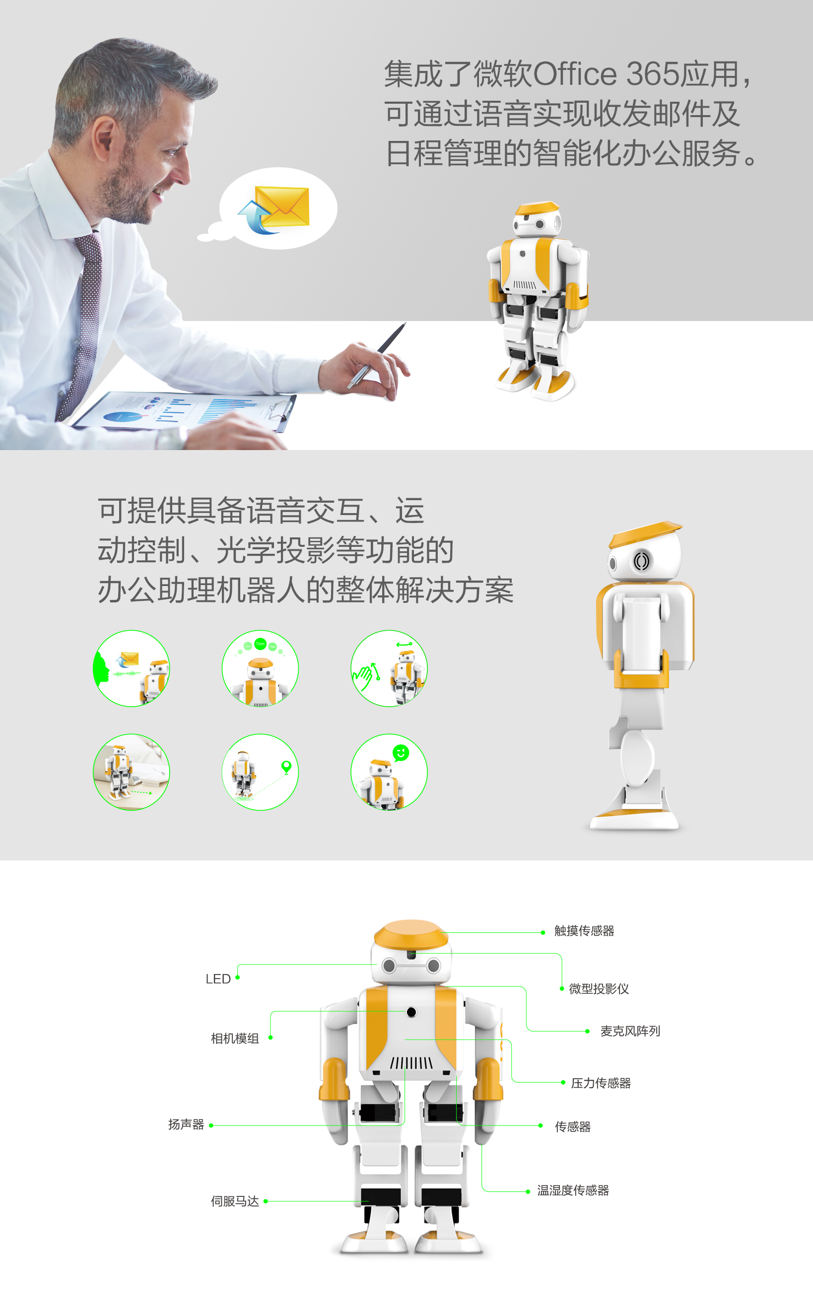 集成了微软Office 365应用,可通过语音实现收发邮件及日程管理的智能化办公服务;可提供具备语音交互、运动控制、光学投影等功能的办公助理机器人的整体解决方案。