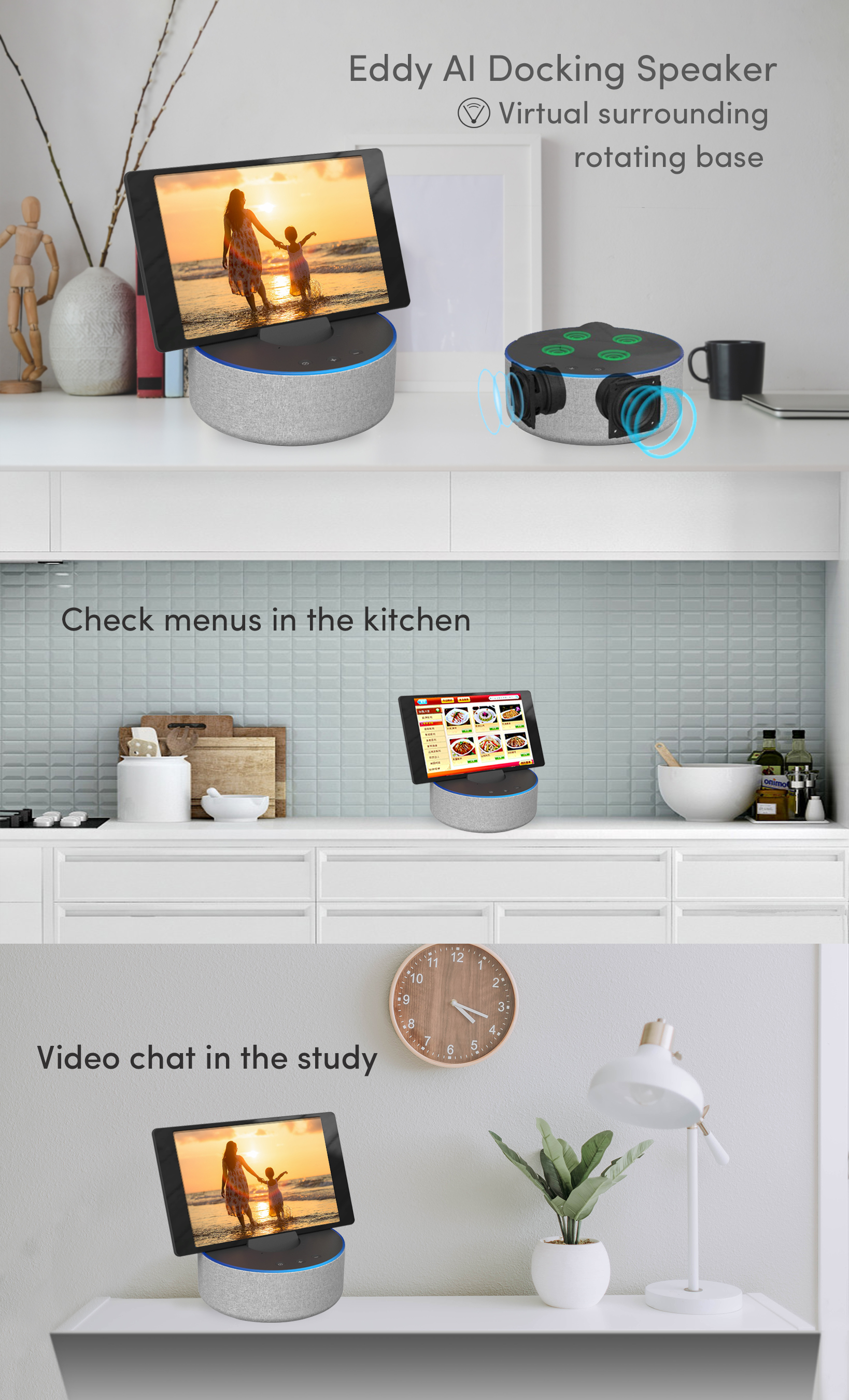 Eddy is a AI Docking Speaker that gives the pad the ability to pick up sounds from the far field. It supports virtual surround sound called STAGE and automatically rotates in the direction of the user according to the direction of the sound.