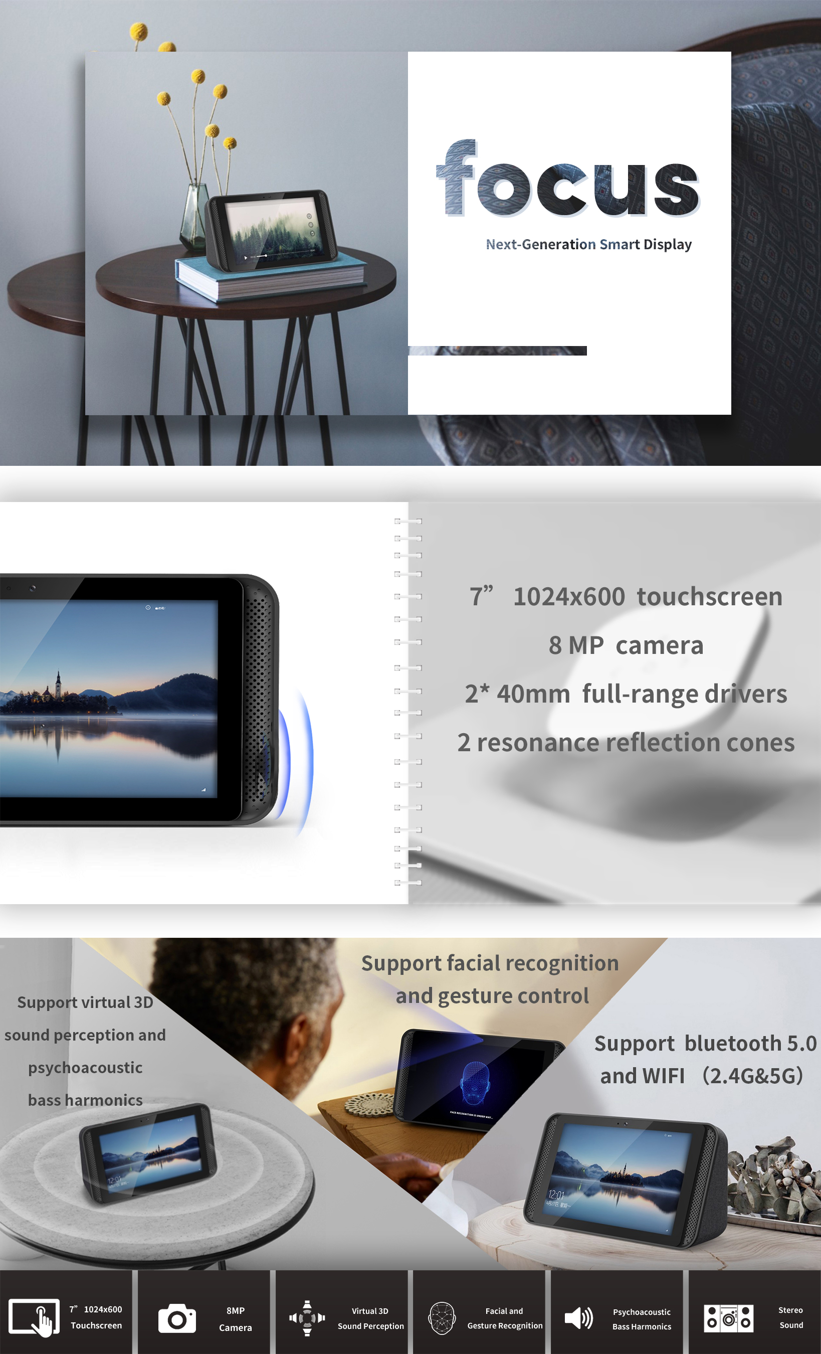 Focus is a smart speaker with screen which has good display effect and excellent sound quality. It is equipped with a colorful high-definition touch screen, which provides an excellent audio-visual experience through its unique acoustic design and powerful audio algorithm. Besides the speech recognition, it also supports face and gesture recognition.